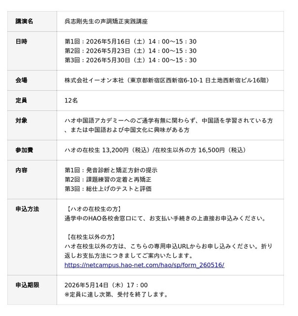 株式会社イーオン(本社:東京都新宿区、代表取締役社長:重野卓)が運営するハオ中国語アカデミーは、NHKラジオ中国語講座の講師として長年、日本人の発音指導に深く携わってこられた呉志剛先生を再び講師にお迎えし、2026年5月16日(土)より全3回の「声調矯正実践講座」を開催いたします。