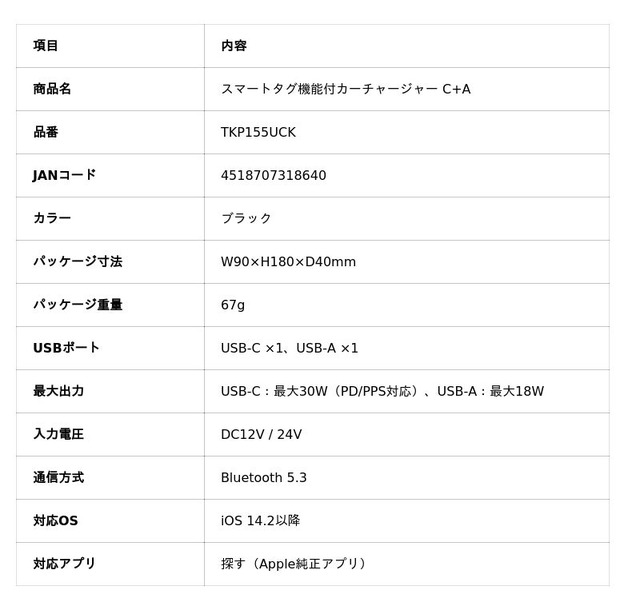 多摩電子工業株式会社(本社:神奈川県川崎市、代表取締役 執行役員社長:杉山 一)は、iPhoneの標準アプリ「探す」に対応したスマートタグ機能を搭載した**「スマートタグ機能付カーチャージャー C+A(型番:TKP155UCK)」**を発売いたします。