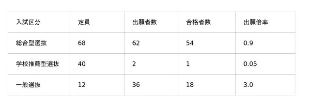 入試区分としては、総合型選抜と学校推薦型選抜で9割程度の定員とし、筆記試験を中心とした一般選抜(国語、英語、数学IAの3教科から2科目選択)では1割程度の定員としました。