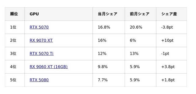 GPU別 市場動向 ― RTX 5070が首位維持、RX 9070 XTが急浮上 ―