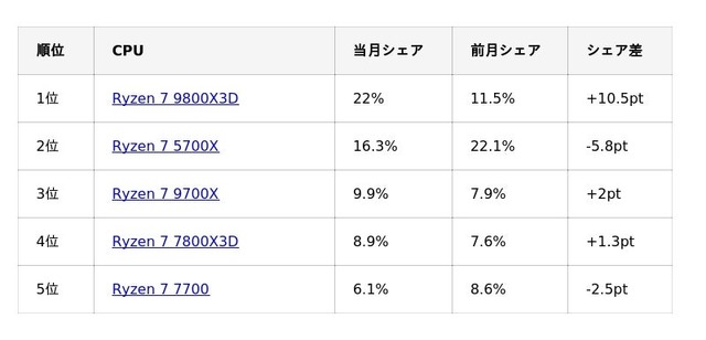 CPU別では、「Ryzen 7 9800X3D」が大きくシェアを伸ばし、首位に立ちました。これまで高い支持を集めていた「Ryzen 7 5700X」は2位となり、コストパフォーマンス重視一辺倒だった流れに変化が見られます。