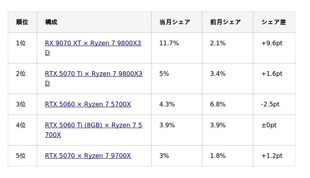 2位には「RTX 5070 Ti × Ryzen 7 9800X3D」が入り、上位は高性能GPUと高性能Ryzenを掛け合わせた構成が占める結果となりました。一方で、前月まで強さを見せていた「RTX 5060 × Ryzen 7 5700X」は順位を下げており、注目の中心が実利ミドル構成から、高性能ミドル~ハイ寄り構成へ移ったことがうかがえます。