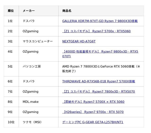 また、ランキング上位には、OZgamingのコストパフォーマンスモデルや、マウスコンピューターのNEXTGEAR、MDL.makeの即納モデルなど、特徴の異なるモデルが並びました。単純に最安帯だけへ関心が集中したのではなく、「性能を明確に取りにいくモデル」と「価格に対して納得感のあるモデル」の双方に注目が集まっていることがうかがえます。