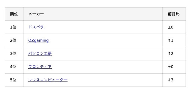 また、前月3位だった「OZgaming」が2位へ、前月5位だった「パソコン工房」が3位へと順位を上げており、上位メーカー間の競争は引き続き活発です。一方で、前月2位だった「マウスコンピューター」は5位に後退しており、メーカー間の差が固定化していないことも今回の特徴でした。