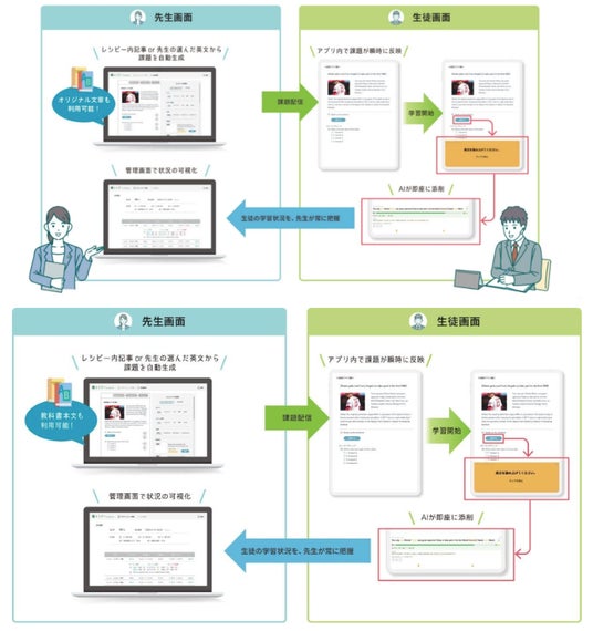 『レシピー for School』内の記事や動画コンテンツ、あるいは教科書や先生の選んだ記事を入力するだけで、授業や宿題に活用できる単語や内容理解の問題、ライティング・ディスカッションのトピックなどをAIが自動で生成します。この機能により、問題作成や採点、さらに生徒ごとの学習の進捗状況といった先生の負担が大幅に軽減されます。