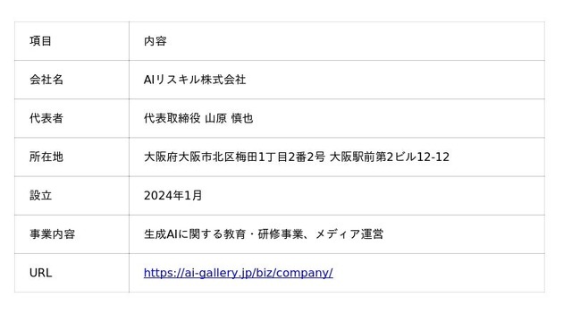 AIリスキル株式会社は、生成AIを活用したコンテンツマーケティングと事業成長支援を主軸とする企業です。日本最大級の生成AIプラットフォーム「AIツールギャラリー」を運営し、記事・動画・データを活用した集客・認知拡大・リード創出を支援しています。加えて、企業・自治体向けに生成AI研修やAI導入・開発支援も提供し、マーケティングと人材育成の両面からAI活用を推進しています。