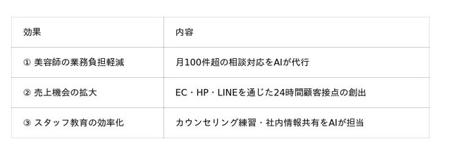 なかでも際立っているのが、全国から月100件以上寄せられる悩み相談への対応です。スタイリスト個人の知見をAIに学習させ、自らの"分身"として全国の潜在顧客に対応させるという活用方法は、美容業界におけるAI活用のモデルケースとなっています。
