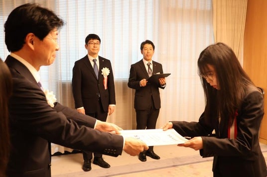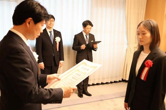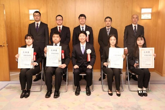 岡山県出身の物理学者、故仁科芳雄博士の偉業を顕彰し、人物・成績ともに優秀な県内在学の理工系大学院修了予定者に贈られる「令和7年度仁科賞」の授与式が2026年3月18日、岡山県庁で行われ、本学大学院環境生命自然科学研究科博士後期課程の中西史美さんと大蘆彩夏さんが伊原木隆太知事から賞状とトロフィーを手渡されました。