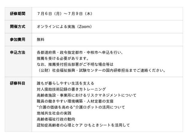 社会福祉施設等で働く職員等に対し専門知識、介護技術の習得及び参加者相互の交流の機会を提供し、福祉サービス向上や地域福祉の推進に寄与することを目的とした研修です。