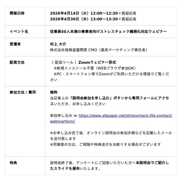 株式会社情報基盤開発(本社:東京都文京区、代表取締役:鎌田長明)が提供する、従業員50人未満の事業場(法人企業・団体)向けストレスチェックサービス「ソシキスイッチストレスチェックLite」サービスについて、WEB版が注文サイトからお申し込みいただけるようになりました。