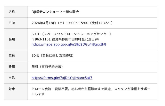 DJIの最新機体を実際に操縦体験できる無料イベントです。当日はまず各機体の特徴や基本的な操縦方法についてのミニセミナーを実施したのち、複数の体験コーナーで気になる機体を自由にお試しいただけます。免許・資格は不要で、ドローンが初めての方でもスタッフがサポートしますので、お気軽にご参加ください。