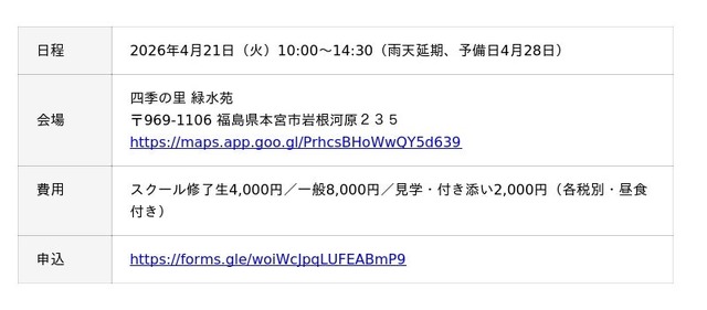 福島ドローンスクールでは、DJI体験会と同じ4月に「空撮の会」も開催します。福島県内の撮影スポットで講師と一緒に空撮を楽しむ定期イベントで、今回で14回目の開催となります。第14回のテーマは「桜×人物表現」。ただ桜を撮るだけでなく、人物を取り入れた表現技法を実践的に学べる撮影勉強会も実施します。