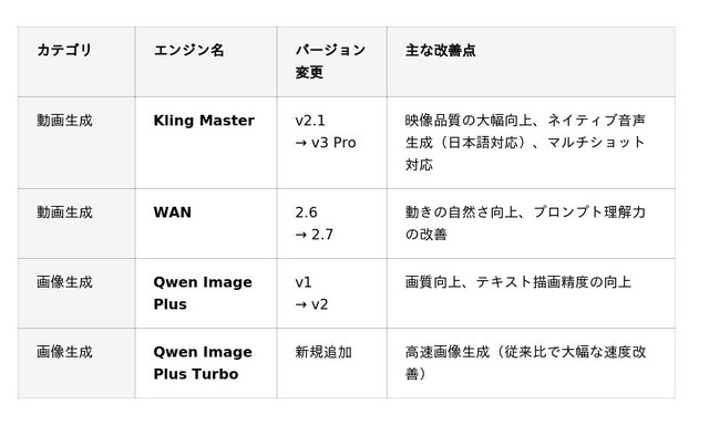 今回のアップグレードでは、動画生成エンジン「Kling Master」を話題のv3 Proへ、「WAN」を最新の2.7へ更新したほか、画像生成エンジン「Qwen Image Plus」のv2化および高速版「Qwen Image Plus Turbo」の新規追加を行いました。