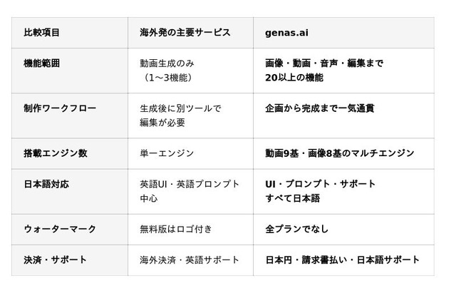 2026年現在、AI動画生成市場では海外発のサービスが多数存在しますが、その多くは「動画生成のみ」の単機能サービスであり、UIが英語のみ、日本円決済非対応、ウォーターマーク付きといった課題を抱えています。