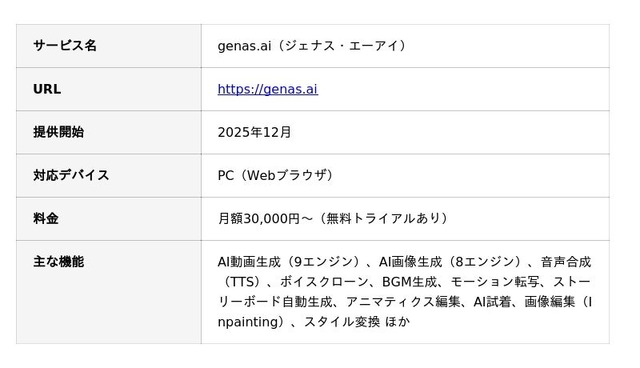AI動画・画像・音声生成のワンストッププラットフォーム「genas.ai」:https://genas.ai
