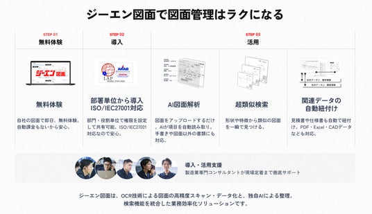 「ジーエン図面」は、OCR技術による図面の高精度スキャン・データ化と、独自AIによる整理・検索機能を統合した、製造業データ活用ソリューションです。製造業を中心に、大手自動車部品や大手工作機械メーカー、加工会社などで導入が進んでいます。