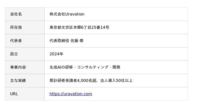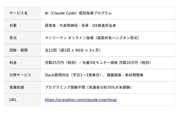 株式会社Uravation(本社:東京都文京区、代表取締役:佐藤 傑)は、AI開発ツール「Claude Code」に特化した経営者・リーダー向けマンツーマン個別指導サービスを2026年4月より開始いたします。プログラミング未経験の経営者でも、3ヶ月で自社の業務自動化を自走できる状態を目指します。