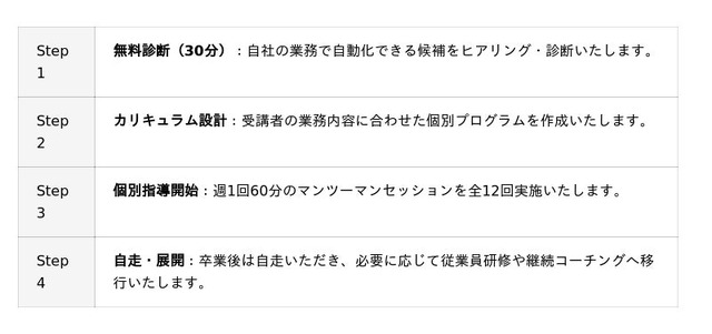 ・ Week 3~4:受講者の実業務シナリオを使い、AIにコードを書かせる体験を行います。