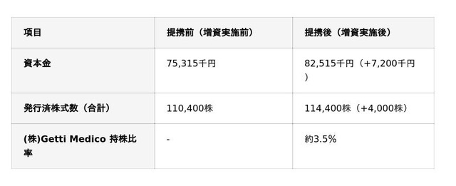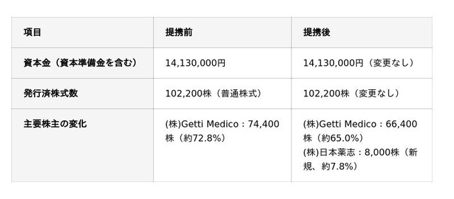 ターゲットヘルスケアの株式を日本薬志が7.8%を取得し、(株)ターゲットヘルスケアの親会社の株式会社Getti Medicoが(株)日本薬志の3.5%の株式を保有します。本資本提携の実施に伴う両社の資本金および発行済株式数の変化は以下の通りです。