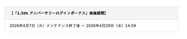本日より、期間中にログインするだけで、最大7,000個のブルークリスタルがもらえるログインボーナスをはじめ、「1.5thアニバーサリーガチャチケット」が累計100枚獲得できるミッションなど、さまざまなイベントを実施いたします。