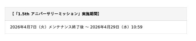 協力ミッションの追加を記念して、特別なガチャチケットがもらえるプレゼントキャンペーンを開催します。期間中に対象の協力ミッションを達成すると、通常のミッション報酬とは別に、ユーザーの皆様へもれなく「1.5thアニバーサリーガチャチケット×10」をプレゼントいたします。