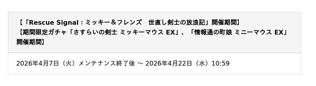 あわせて、新キャラクター「さすらいの剣士 ミッキーマウス EX」、「情報通の町娘 ミニーマウス EX」がラインナップされた期間限定ガチャも開催いたします。どちらのキャラクターも、バトルでの活躍はもちろん「ステージクリア時の獲得RSポイントを増加させる」という、本イベント期間限定のアビリティを持ったキャラクターとなっています。ぜひお見逃しなく!