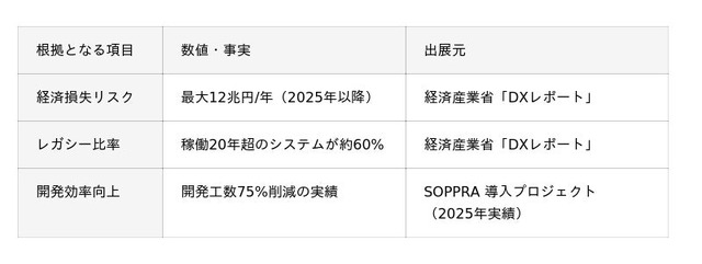 本技術は、某大手製造業において開発工数75%削減という圧倒的な成果を達成。 経済産業省が警鐘を鳴らす「2025年の崖」による年間12兆円の経済損失リスクを回避する、唯一無二のソリューションとして展開します。