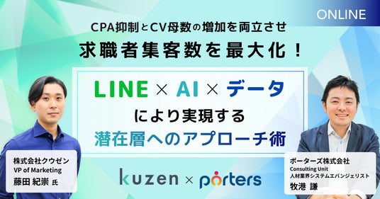 人材ビジネス向けマッチングシステムを提供するポーターズ株式会社(東京都港区、代表 西森 康二)は、株式会社クウゼンと共同で「CPA抑制とCV母数の増加を両立させ、求職者集客数を最大化! LINE×AI×データにより実現する、潜在層へのアプローチ術」と題した無料セミナーを2026年4月17日(金)16:00~と、4月23日(木)14:00~の2日間、オンラインで開催いたします。