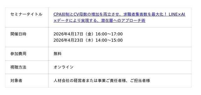 また、セミナー内では、実際に潜在層集客に成功している事例も紹介。長期的にCPAを改善し、持続可能な求職者獲得を実現するためのノウハウをお届けします。