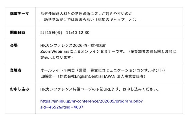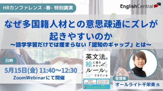オンラインで英語を話せるようになるためのトレーニングを行うことができる『EnglishCentral』を企業・学校法人向けに提供する株式会社EnglishCentral Japan (本社:東京都台東区、代表取締役: アラン シュワルツ、以下、イングリッシュセントラル)は、2026年5月15日(金)に開催される日本の人事部主催「HRカンファレンス2026-春-」にて、言語、異文化コミュニケーションコンサルタントのオールライト 千栄美氏をお招きして講演を行います。本講演では、企業内多国籍人材の採用が進む中で、日本固有の人事制度、独特な商習慣、言語力の壁だけでは説明できない、コミュニケーションの課題について言語認知の観点から解説をいたします。