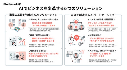 AI活用は競争力維持のために不可欠な要素となっています。しかし、多くの企業が「データが整備されていない」「現場への定着が進まない」「具体的な成果に繋がらない」といった課題に直面しています。ストックマークは、こうした課題を包括的に解決するため、以下の6つソリューションを提供しています。
