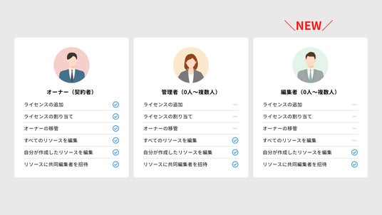 今回のリリースにより、ユーザーライセンスは「オーナー」「管理者」「編集者」の3種類となりました。