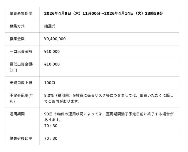 株式会社パートナーズ(本社:東京都港区、代表取締役社長CEO:吉村 拓、以下「当社」)は、小規模不動産特定共同事業法の電子取引認可に基づき、スマートフォンで1万円から始められる都心の中古マンションに特化したクラウドファンディングサービス「PARTNERS Funding(パートナーズ ファンディング)」Vol.39を組成し、2026年4月9日午前11時よりサービスサイトにて出資の募集を開始します。
