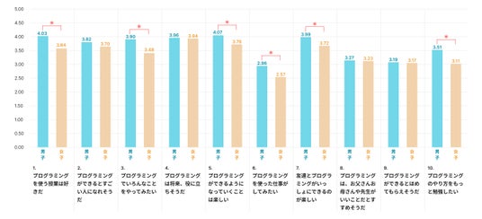 男子の方が高い傾向が見られました。特に、「プログラミングを使う授業が好き」「いろいろ試してみたい」「できるようになっていくことが楽しい」といった、学習への興味や関心に関する項目で差が確認されました。これにより、理解度そのものだけでなく、学習への入り口となる関心や継続意欲の段階で差が生じる可能性が示されました。