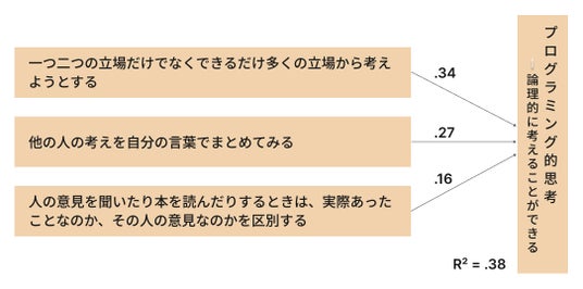続いて、プログラミング学習において重要とされる「論理的に考えてプログラムを組み立てる力」に、どのような要因が関係しているかを分析しました。(※4)(※5)