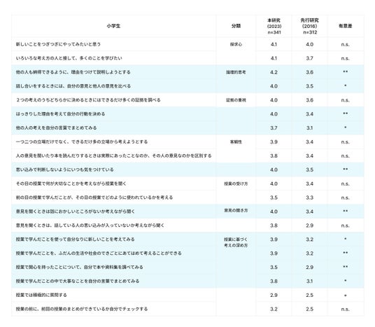 性差は比較的小さい結果となりました。また、2019年に当社が実施した同様の調査との比較では、2023年の児童の方が多くの項目で批判的思考態度が高い傾向と確認されました。こうした変化が教育の影響によるものか、社会環境の変化によるものかは本研究だけでは断定できませんが、児童の思考態度に変化が生じている可能性が示されました。