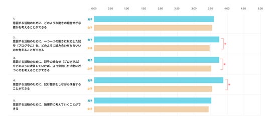 男子が「プログラムの組み合わせを考える」「プログラムを改善する」「試行錯誤しながら動きを調整する」といった項目で高い傾向を示しました。一方で、「論理的に考える」といった項目では性差が見られないものもありました。これにより、性差が現れやすいのは、プログラムの構成や改善といった具体的な作業に対する自己効力感(「自分ならできる」という認識)であり、論理的思考そのものとは必ずしも一致しない可能性が示されました。