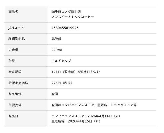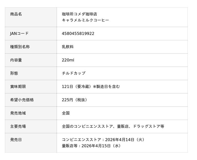 トーヨービバレッジ株式会社(本社:東京都渋谷区、代表取締役社長:熊谷聡)は、株式会社コメダ(本社:愛知県名古屋市、代表取締役社長:甘利祐一)と共同開発した「珈琲所コメダ珈琲店 キャラメルミルクコーヒー」と、「珈琲所コメダ珈琲店 ノンスイートミルクコーヒー」を2026年4月14日(火)より全国のコンビニエンスストア、4月15日(水)より量販店等にて順次発売致します(一部地域・一部店舗を除く)。