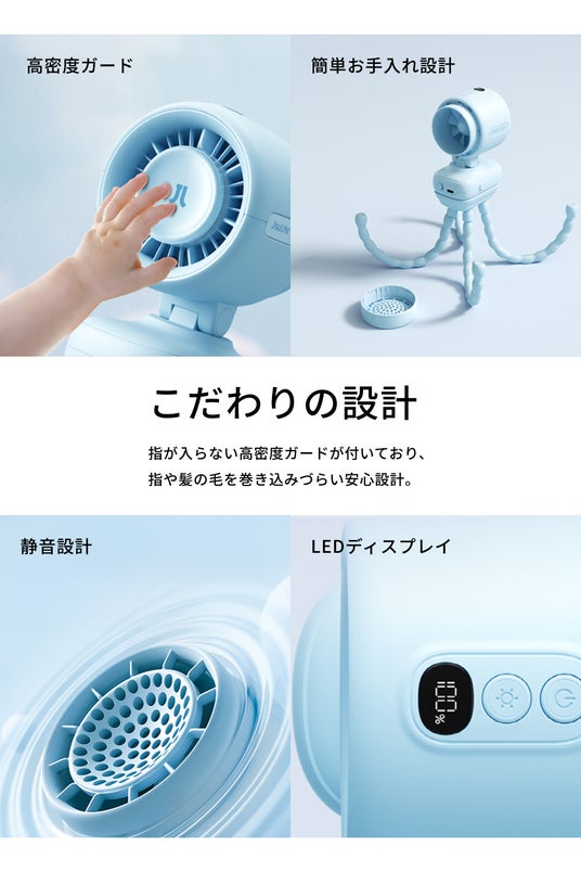 高密度メッシュガードにより指や髪の毛を巻き込みづらい安心設計。また、誤作動防止ロックも搭載しています。