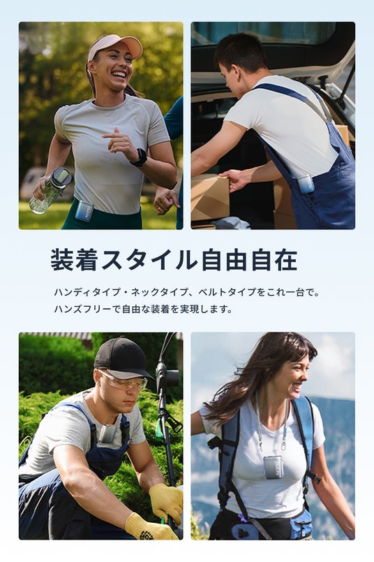 ハンディタイプ・ネックタイプ、ベルトタイプをこれ一台で。ハンズフリーで自由な装着を実現します。