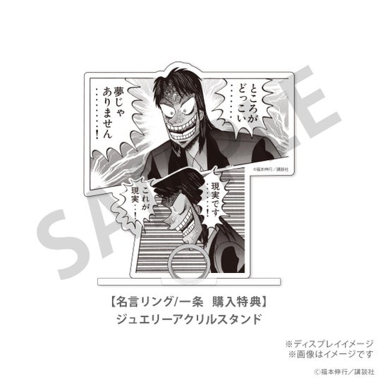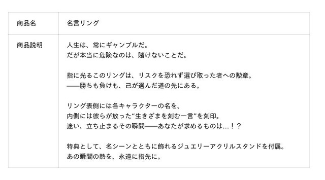 このたびの新作は、リングの表側に各キャラクターの名前を、内側には彼らが放った“生きざまを刻む一言”を刻印しました。購入特典として商品1点ご購入につき、アクリルジュエリースタンドを1つプレゼントいたします。