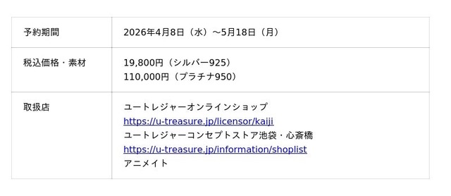 株式会社ユートレジャー(本社:東京都新宿区、代表取締役社長:青木 興一、株式会社ケイ・ウノの連結子会社)は、人気ギャンブル漫画『カイジ』とのコラボレーションアイテム「名言リング」を発売します。2026年4月8日(水)~5月18日(月)の期間、ユートレジャーオンラインショップ、ユートレジャーコンセプトストア池袋・心斎橋にて予約受付を行います。
