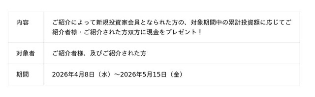 ※紹介者の方(既に投資家の方)ご自身の投資額は、プレゼント金額には関係ございません。