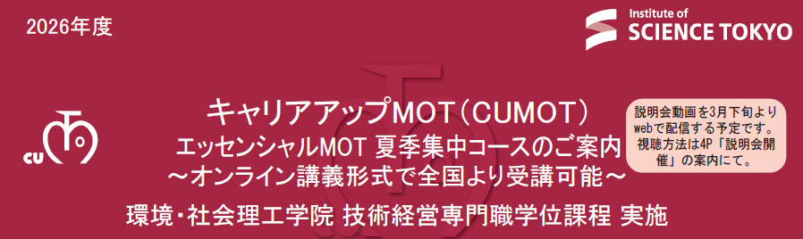 東京科学大学(Science Tokyo)では、MOT(技術経営)に関する社会人向けプログラムとして、キャリアアップMOT「エッセンシャルMOT夏季集中コース(2026年度)」を開講します(実施主体:環境・社会理工学院 技術経営専門職学位課程)。