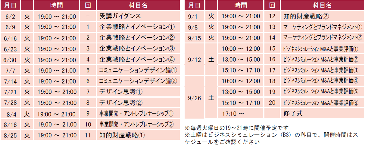 本コースは、「企業戦略とイノベーション」「事業開発・アントレプレナーシップ」など、働きながらMOTのエッセンスを4ヶ月間で学びます(7科目、全20回)。講義は平日夜(一部、土曜)に実施で、Zoomによるオンライン講義形式のため全国から参加が可能です。通学の負担がなく、欠席時のレコーディング、動画のフォローなど、育児中の方なども受講しやすいです。