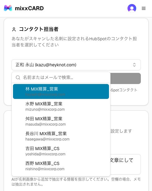 HubSpotに登録済みのユーザー情報とシームレスに連携。代理登録機能も備えており、営業担当が交換した名刺を事務担当者が登録しても、登録者名は営業担当として記録されます。