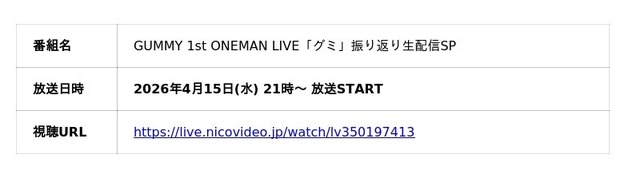 「GUMMY 1st ONEMAN LIVE『グミ』振り返り生配信SP」を、2026年4月15日(水)21時よりニコニコ生放送にて配信いたします。