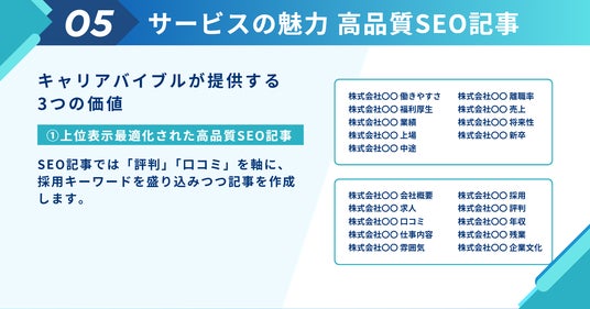 職場環境・社風・キャリアパス・待遇を事実ベースで整理した記事を提供し、候補者が最初に目にする情報を自社でコントロールできる状態をつくります。