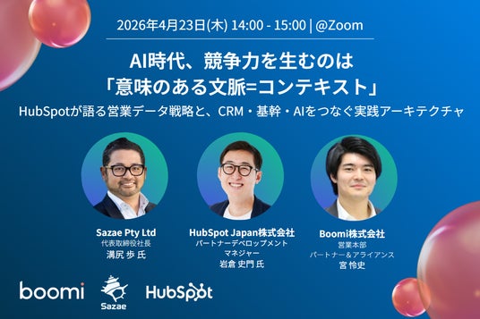 Boomi株式会社(所在地:東京都渋谷区/代表取締役社長 CEO:河野 英太郎/以下、Boomi)は、Sazae Pty Ltd(所在地:シドニー・オーストラリア/代表取締役社長:溝尻 歩/以下、Sazae)と共催で、2026年4月23日(木)14:00~15:00に、『AI時代、競争力を生むのは「意味のある文脈=コンテキスト」~ HubSpotが語る営業データ戦略と、CRM・基幹・AIをつなぐ実践アーキテクチャ~ 』と題したウェビナーを開催いたします。今回は、特別ゲストスピーカーとしてHubSpot Japan株式会社パートナーデベロップメントマネージャーの岩倉 史門 氏をお迎えします。参加費は無料、事前登録制となっています。