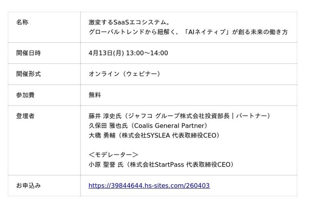 本提携でも目指す「AIネイティブな企業経営」の最前線をお伝えするウェビナーを開催します。「SaaSの死」が囁かれる今、これからの企業経営とソフトウェア選びの基準はどう変わるのか。本ウェビナーでは、米国のスタートアップ動向に詳しい有識者と国内トップVCをゲストにお迎えし、激変するグローバルトレンドを紐解きます。